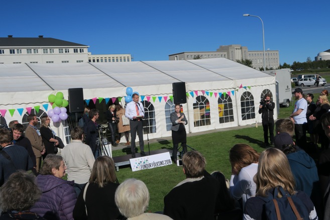 Forseti flytur ávarp við upphaf Fundar fólksins við Norræna húsið.