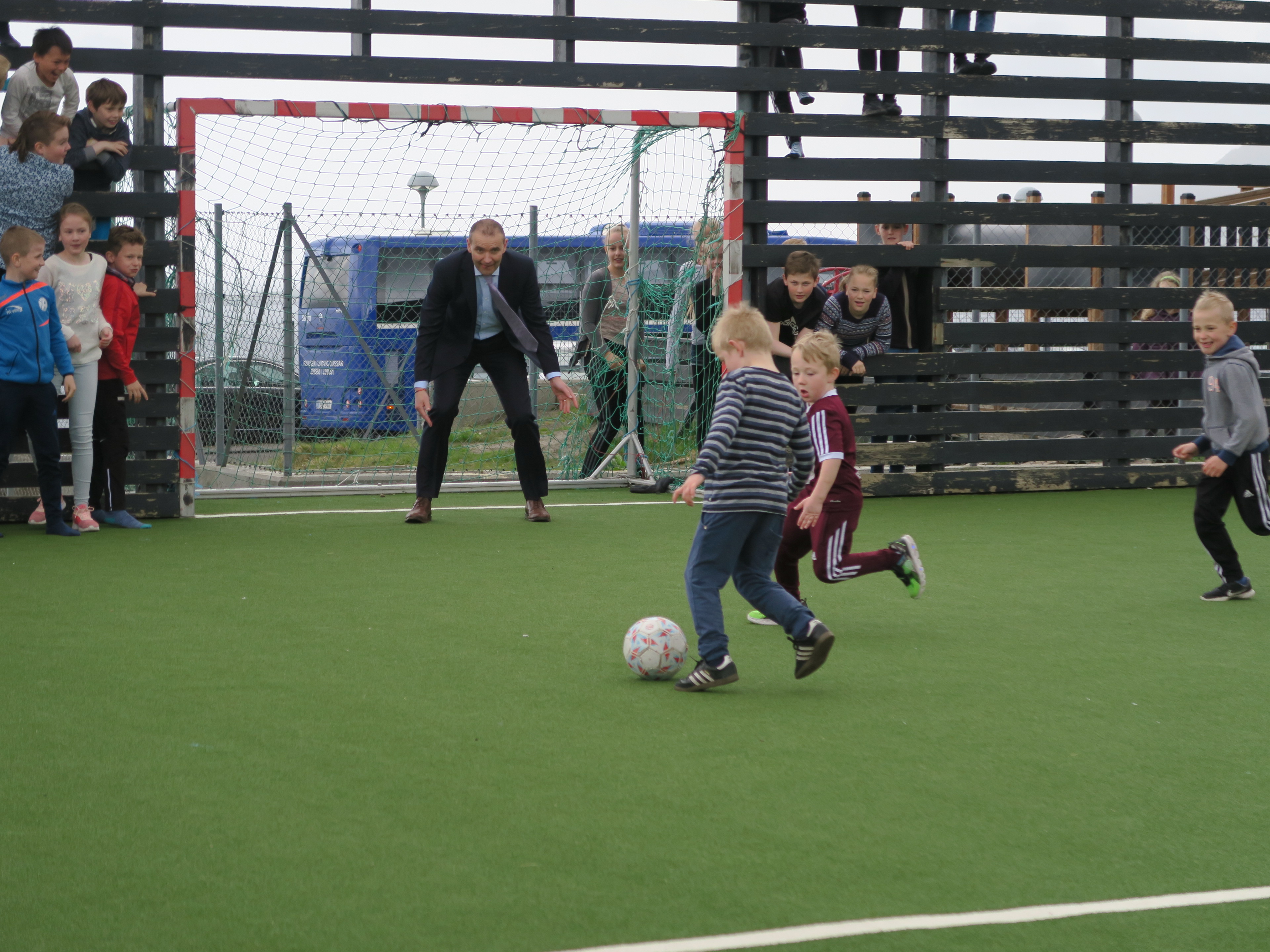Forseti leikur knattspyrnu við skólakrakka í Þórshöfn í Færeyjum.