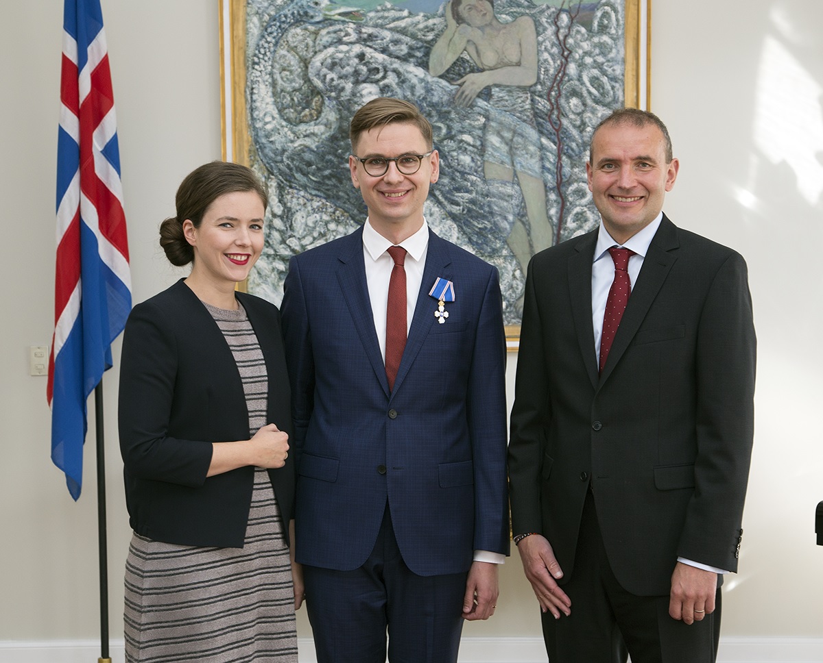 Víkingur Heiðar Ólafsson, sem sæmdur var fálkaorðu fyrir framlag sitt til tónlistar, ásamt Höllu Oddný Magnúsdóttur og forseta.
