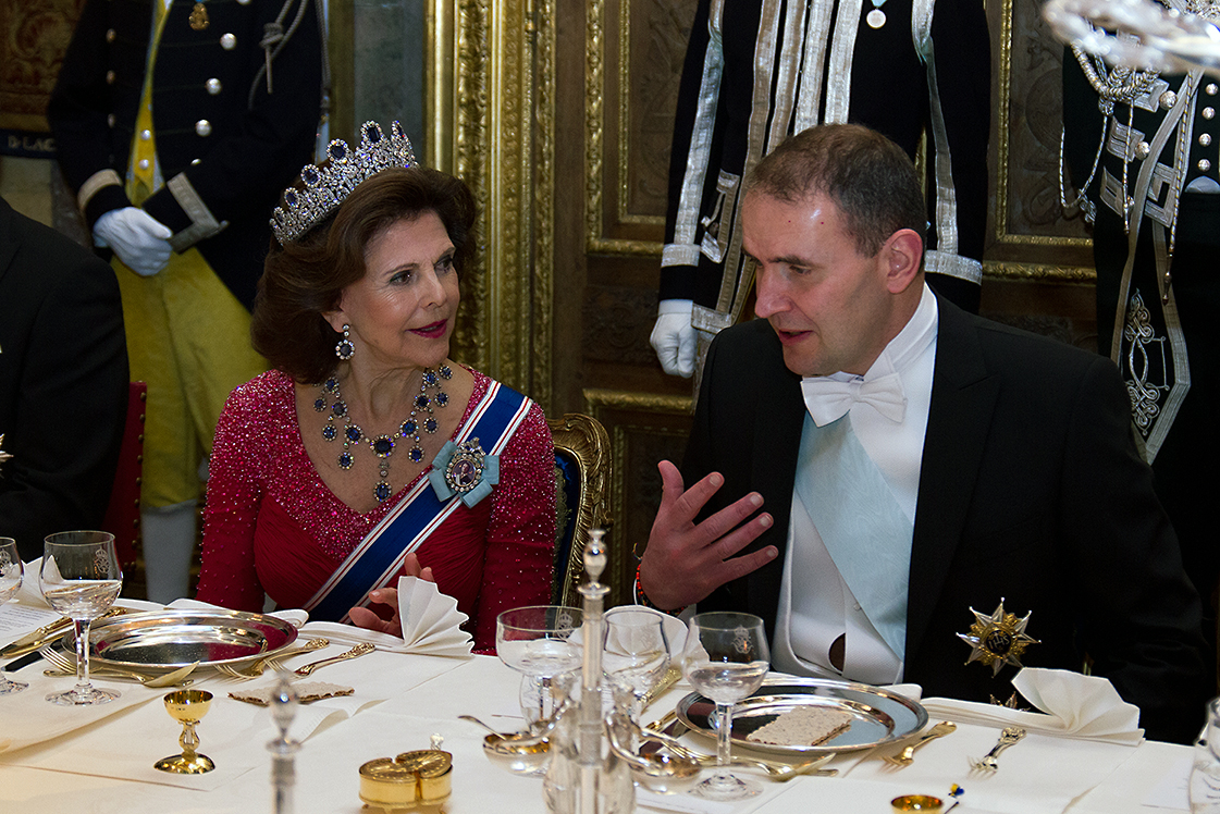 Forseti situr hátíðarkvöldverð við hlið Sylvíu Svíadrottningar í ríkisheimsókn til Svíþjóðar 17. janúar 2018.