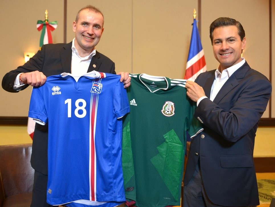 Skipst á landsliðsbúningum við Enrique Peña Nieto, forseta Mexíkós, í vinnuferð til Play del Carmen árið 2018.