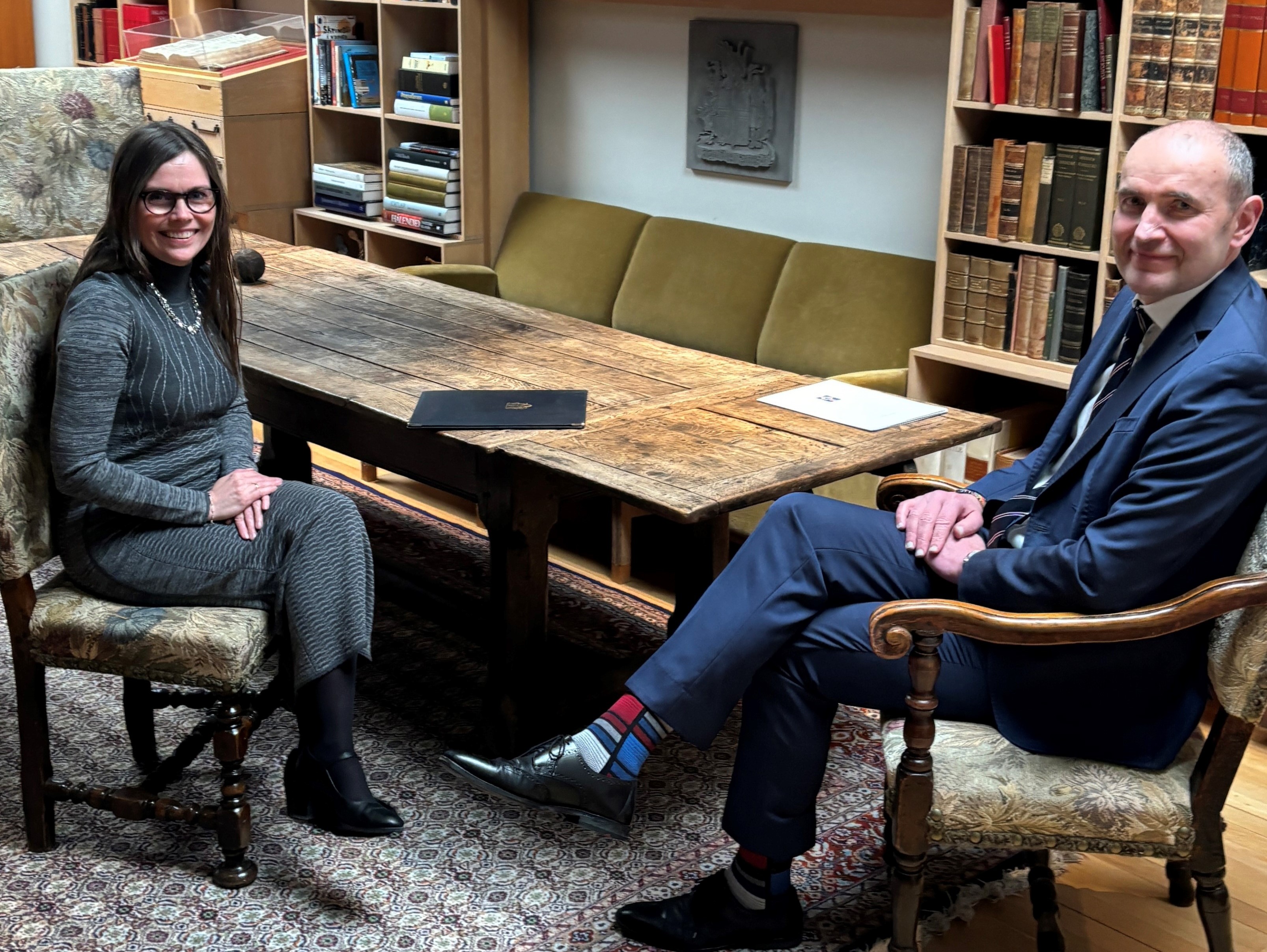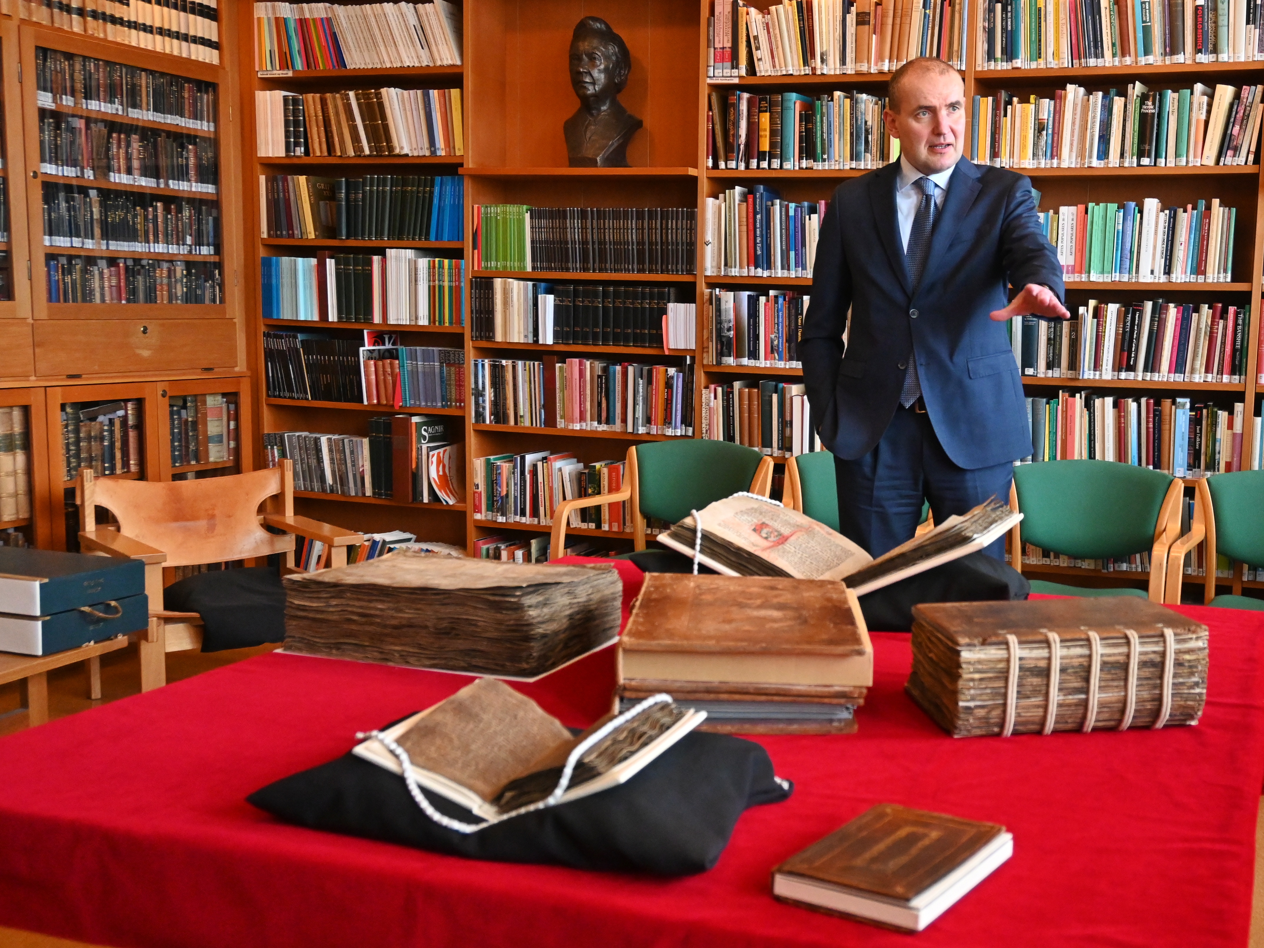 Forseti skoðar handrit í heimsókn sinni til Stofnunar Árna Magnússonar á Íslandi.